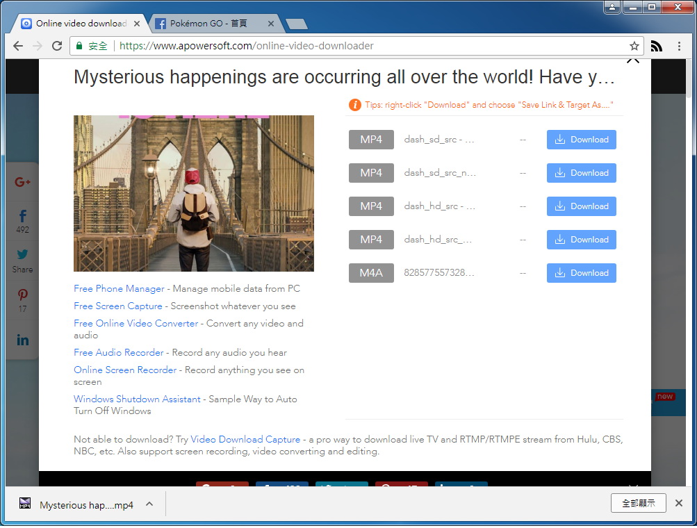 4. 短暫的分析後,可下載的格式就會列出來了… 有支援多種影片、串流、音樂等格式。選好要下載的格式後,在「Download」處按滑鼠右鍵選「另存連結為...」,左下角就可以看到開始下載囉。