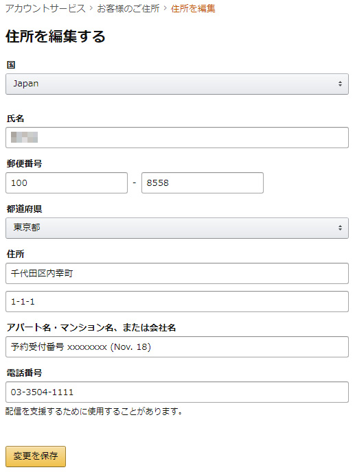 注意這邊的「氏名」欄位最好是填寫跟訂房入住者一樣名字,另外我會習慣把訂房網站的預約號碼和 Check-in 日期填寫於 Optional 的「アパート名・マンション名、または会社名」欄位,以方便飯店人員更快速的代收包裹。填寫完畢後按下「變更保存」即可完成飯店地址的登陸。