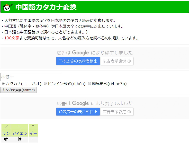 使用方法相當簡單,先在上方的欄位中輸入要查詢的中文名字,然後按下「カタカナ変換(convert)」的按鈕,結果就會在下面顯示出來了。