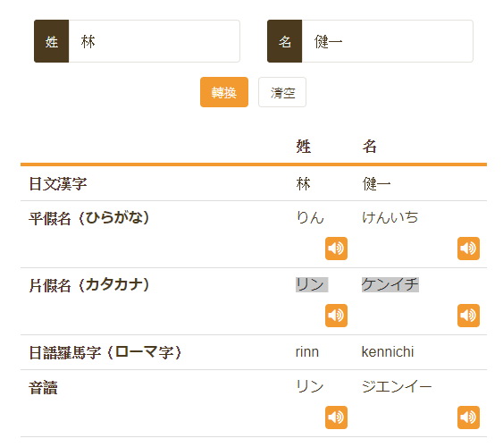 同樣以中文姓名「林 健一」為例,結果會把音讀拼音直接用平假名跟片假名分別顯示出來,「リン ケンイチ」就是「林 健一」的音讀拼音,是不是也很簡單呢。另外最下面也會把第一種方式發音直接轉換的結果顯示出來,因此這個網站相當推薦使用喔。
