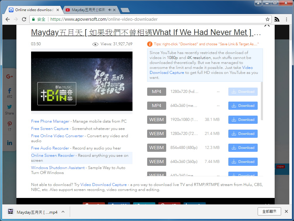 4. 短暫的分析後,可下載的格式就會列出來了… 有支援多種影片、串流、音樂等格式。選好要下載的格式後按下「Download」,左下角就可以看到開始下載囉。